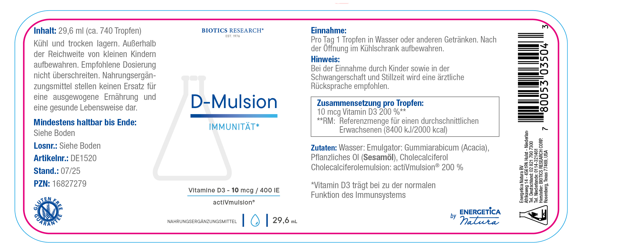 D-Mulsion ist ein Vitamin D-Produkt von Biotics Research. Die natürliche Mikroemulsion sorgt für eine schnelle und nahezu vollständige Aufnahme von Vitamin D und ist für die tägliche Anwendung geeignet. Neben der hohen biologischen Verfügbarkeit enthält jeder Tropfen Mikroemulsion eine garantierte Dosis Vitamin D3.