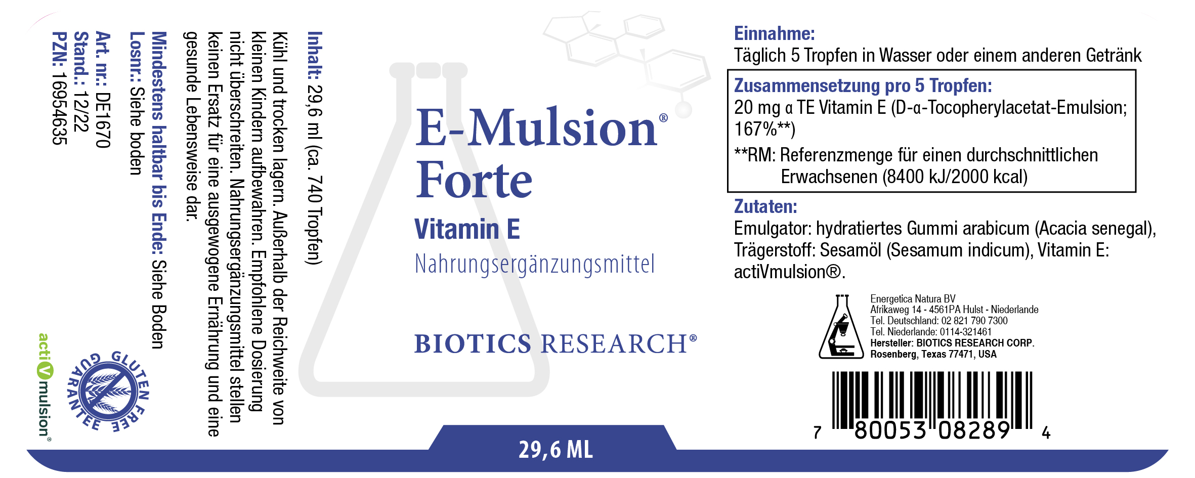 Emulgator: Hydratisiertes Gummi arabicum, Träger: Sesamöl, α-TE Vitamin E (actiVmulsion®)
