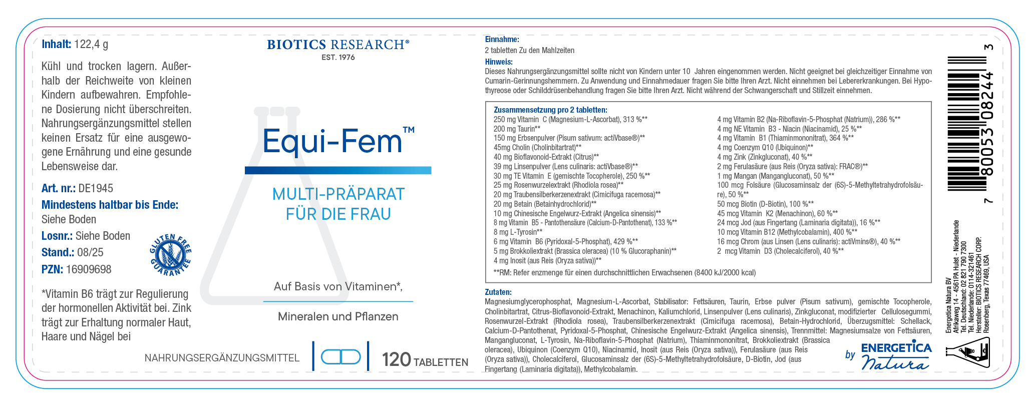 Equi-fem ist ein komplettes Multipräparat für die Frau und ein Essential by Energetica Natura. Dieses Nahrungsergänzungsmittel ist ein vegetarischer Komplex mit Brokkoli-Extrakt (DIM), Rhodiola roscea, Angelica sinensis und Cimicifuga racemosa. Es trägt unter anderem zur Instandhaltung normaler Knochen, von Haaren, Haut und Nervensystem bei.