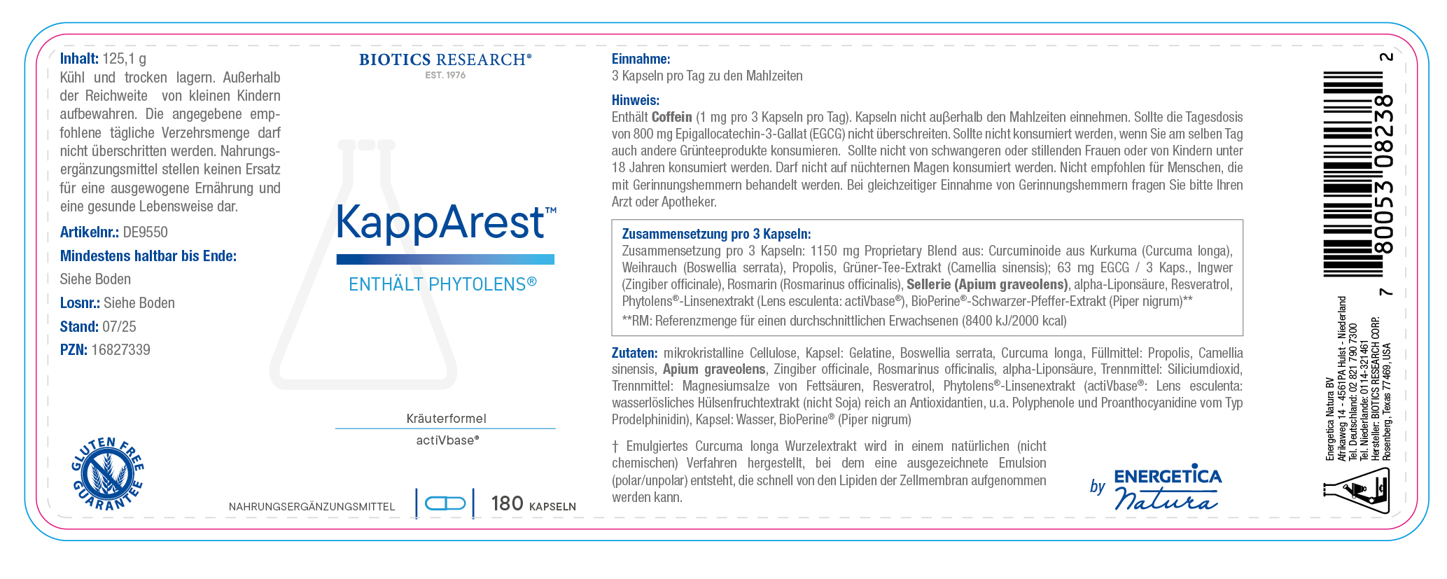 Füllstoff: Mikrokristalline Cellulose, Kapsel: Gelatine, Feuchthaltemittel: Gereinigtes Wasser, Proprietäre Mischung: (Curcuminoide aus Kurkuma, Indischer Weihrauch, Propolis, Grüntee-Extrakt, Ingwer, Rosmarin, Sellerie, Alpha-Liponsäure, Resveratrol, Phytolens® Linsenextrakt, BioPerine®-Schwarzer Pfefferextrakt), Trennmittel: Siliciumdioxid, Magnesiumsalze von Fettsäuren