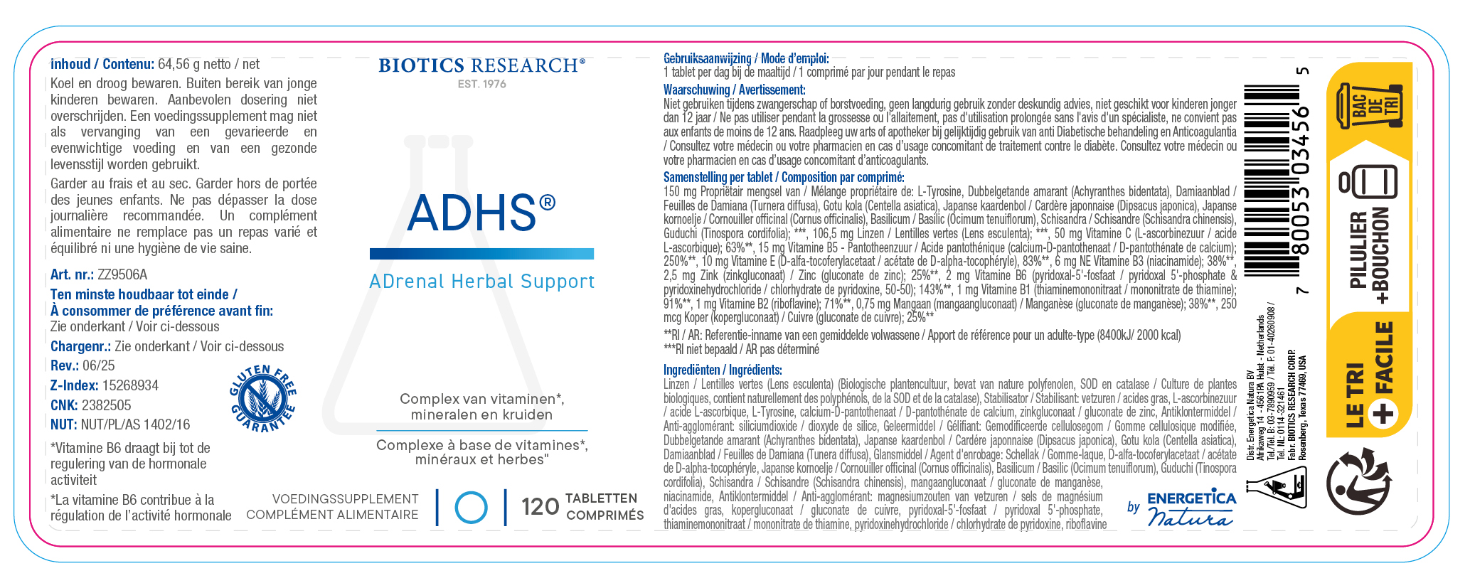 ADHS of Adrenal Herbal Support, is een bijnierondersteunend complex van vitamines, mineralen en kruiden. De samenstelling draagt bij tot de regulering van de hormonale activiteit, het verminderen van vermoeidheid en de normale werking van het zenuwstelsel.