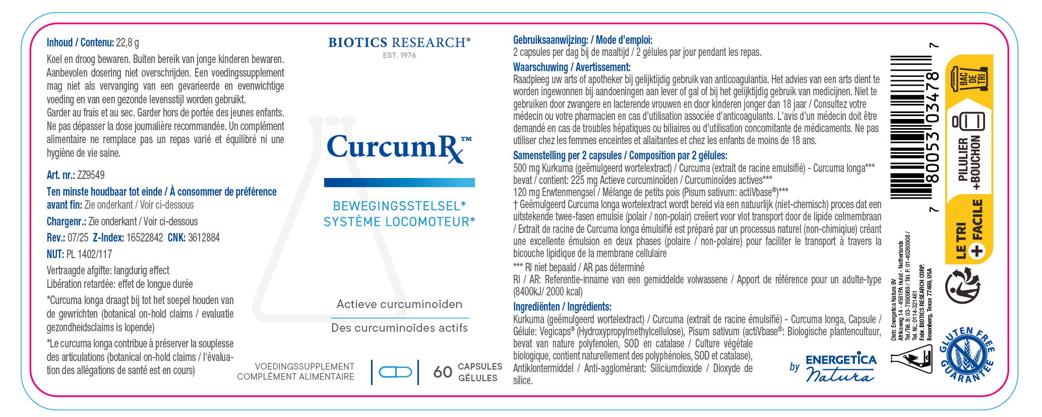 kurkuma (geëmulgeerd wortelextract), capsule: vegicaps® (hydroxypropylmethylcellulose), pisum sativum (actiVbase®: biologische plantencultuur, bevat van nature polyfenolen, SOD en catalase), anti-klontermiddel: siliciumdioxide
