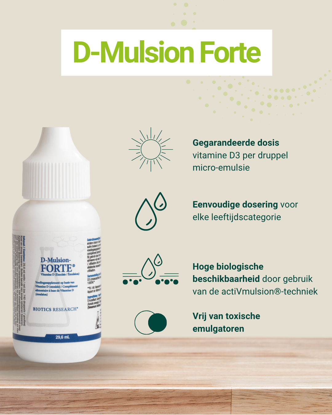D-mulsion forte is een hooggedosseerde micro-emulsie van vitamine D, wat zorgt voor een snelle en vrijwel volledig opname. Vitamine D draagt bij tot de instandhouding van normale botten en ondersteuning van het imuunsysteem.